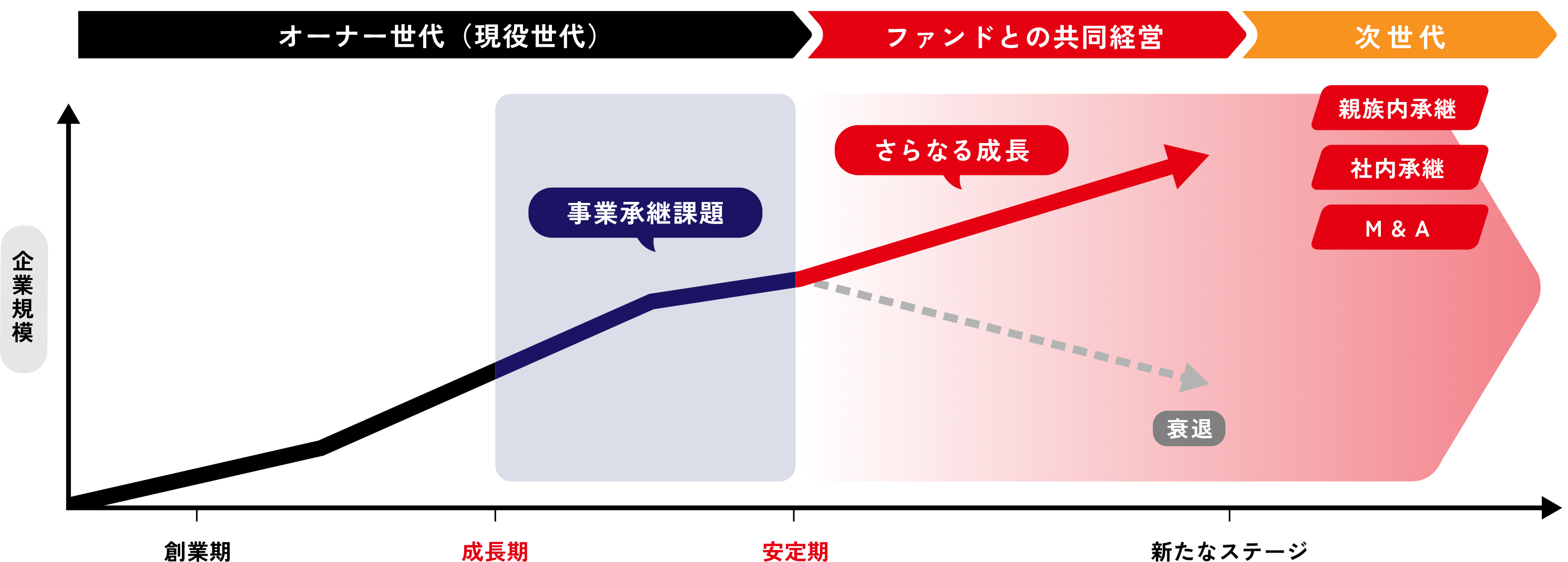 成長を続け、安定した業績を残されてきた企業であっても、多くのケースで事業承継を起点とした経営課題を抱えておられます。私たちは投資活動を通じて企業の経営に参画し、円滑な事業承継とさらなる成長をご支援いたします。